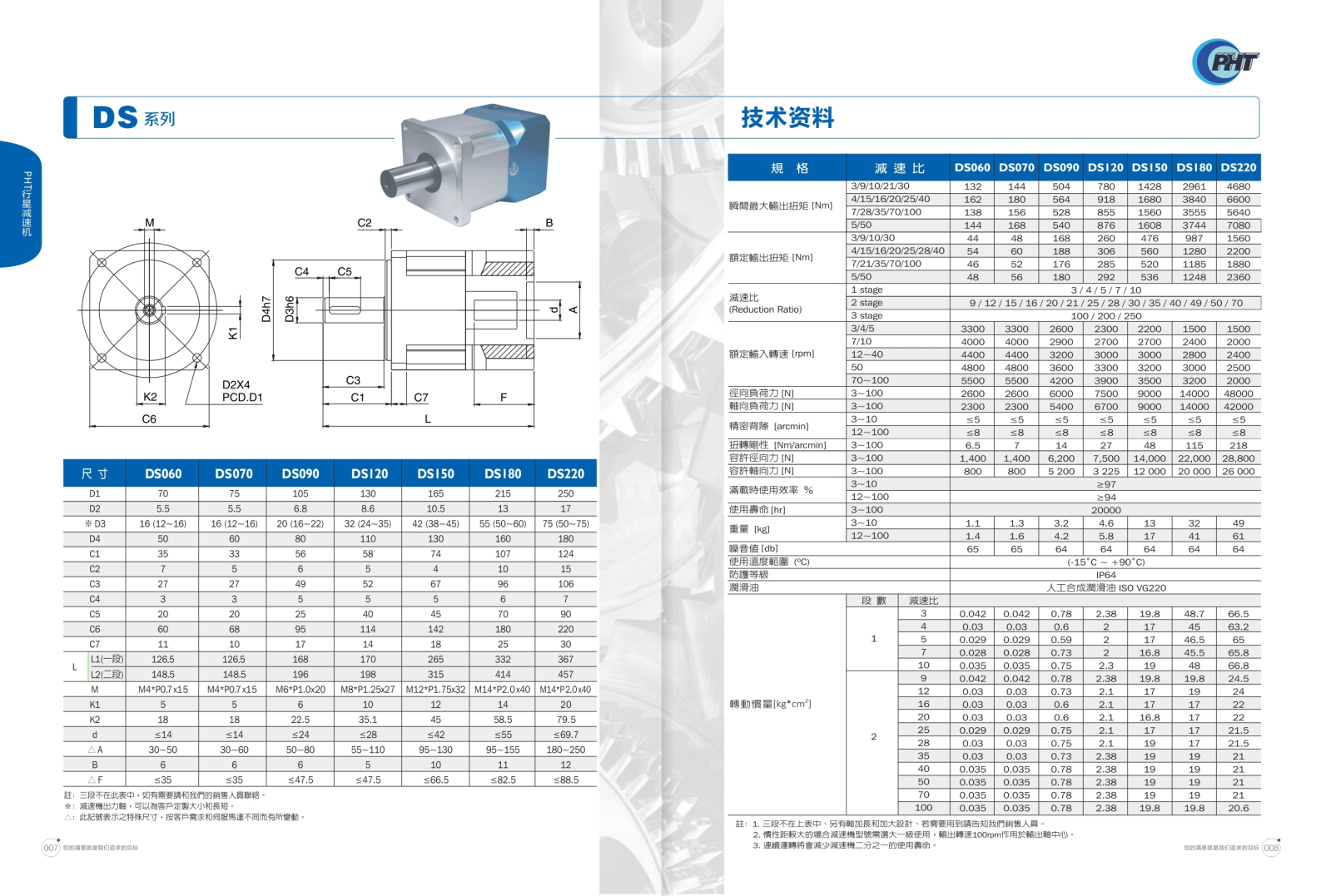 DS 系列是一體成型高精度減速機,相比DM精度更高,價格要高。 品宏減速機的軸承是用NSK品牌的,齒輪經過碳化,故精度和剛性都比較優越!減速機出力軸是可根據客戶的要求去定制大小和長短的。